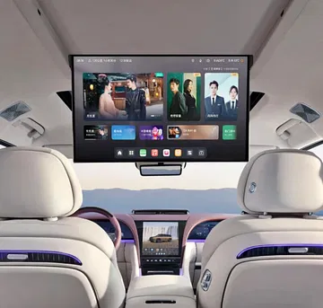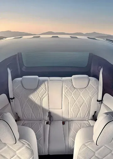 Del techo sale una pantalla de 21,4 pulgadas que se complementa con un sistema de sonido de 32 altavoces, y si quieres luz natural tendrás bastante gracias al techo panorámico de 1,7 m². También equipa un frigorífico con función frío/calor, ventanas inteligentes con privacidad automática y 13 tomas de corriente repartidas por todo el habitáculo. Por supuesto, en las plazas delanteras lleva la última tecnología en cuanto a multimedia.