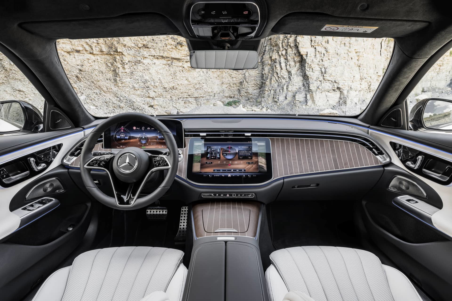 Con respecto a su predecesor, el salto generacional del Mercedes-Benz Clase E que ya se produjo en la quinta generación resulta más evidente gracias sobre todo al diseño de su salpicadero y de la consola central, algo que en la sexta tiene continuidad. Siendo uno de los grandes buques insignia en materia de berlinas premium, el interior de la Clase E cuenta con materiales de gran calidad y grandes acabados. Mercedes pone a disposición de los clientes tanto cuero de alta calidad como materiales que no son de origen animal, todo ello combinado con superficies metálicas o acabadas en madera.