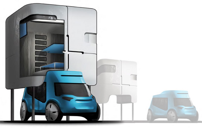 Todo el mundo conoce hoy en día el concepto de «dock station», utilizado para conectar los dispositivos digitales y aumentar sus prestaciones, ya sea mediante altavoces, pantallas o añadiendo conectividad. Pues imaginaros el mismo concepto aplicado al mundo del automóvil y la vivienda. Esto es lo que nos ofrece Jon Salerno con su concepto de microvivienda «habitat».