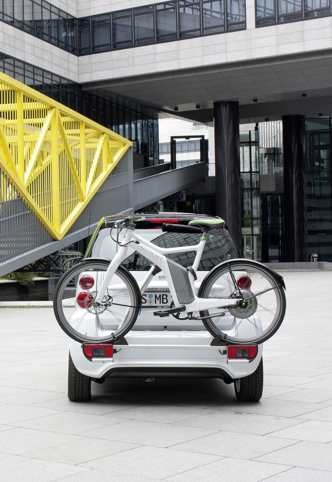 Su diseño parece funcional, y según la nota de prensa, inspirado en los diseño de los Smart Fortwo. Esto es complicado de ver, cosas de los diseñadores, ya sabéis… Sus formas tan poco convencionales _(a menos que hablemos de una bicicleta con suspensión trasera)_ están motivadas para albergar la batería de ión-litio, situada sobre el pedalier, en el centro del cuadro. Un cuadro que es de aluminio y plástico, contrastando ambos materiales como en los coches de la marca.