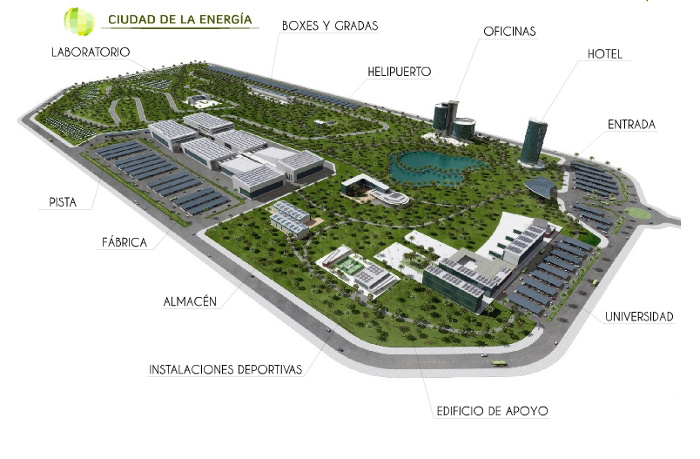 La ciudad de la energía hace honor a el principio de 0 emisiones de los vehículos que se van a producir en su interior y a través de la energía geotérmica y solar el centro es autosuficiente y no necesitaría de conexión a la red eléctrica convencional.