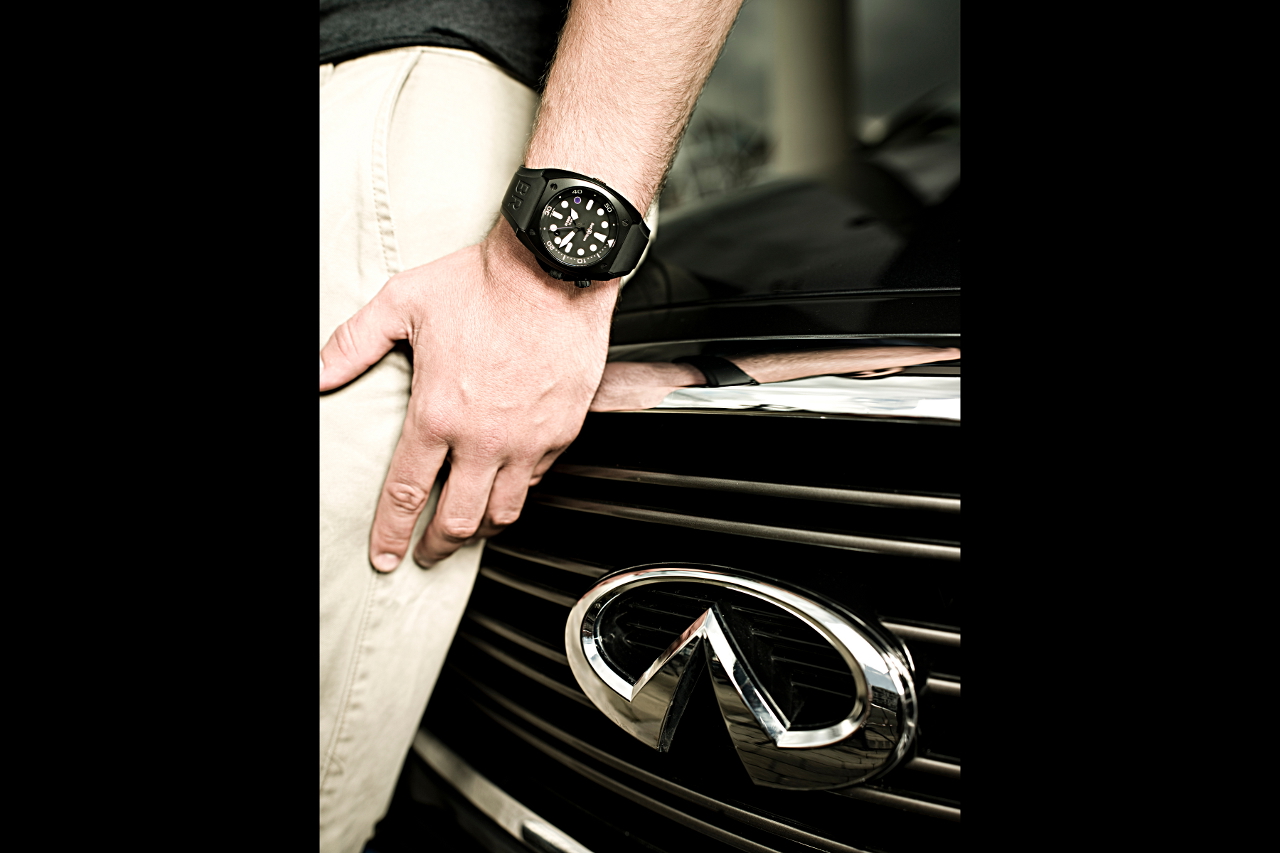 El reloj en sí contiene una serie de detalles que asocian su diseño a la marca Infiniti. El segundero y el punto que marca las 8 están pintados en el color púrpura con el que se relaciona al fabricante. Haber elegido este número para distinguirlo del resto es un guiño al símbolo del infinito, que se asemeja a un 8 tumbado y además representa también el número de la suerte en Asia.