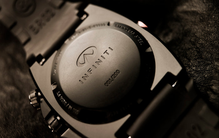 Como detalle de exclusividad y discreción se encuentra el logo de Infiniti grabado en la parte trasera del reloj junto al número de unidad de la edición. El modelo tiene las funciones de horas, minutos y segundos. También añade la fecha con el número de día, aunque no el calendario perpetuo.
