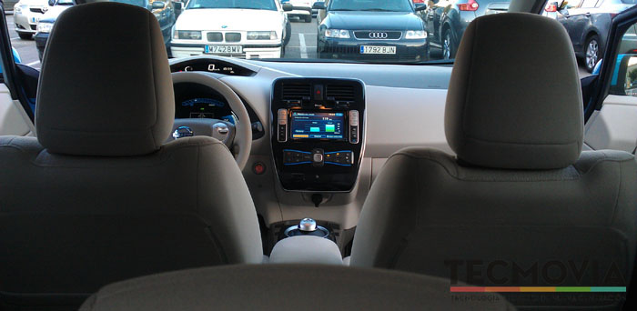 Al entrar en el Leaf descubrimos un sistema multimedia enorme y táctil, recordando a la del Volkwagen Polo y dos paneles informativos tras el volante, uno que nos detalla información sobre velocidad, hora y demás, y otro que advierte sobre la energía que utilizamos/aprovechamos durante la conducción a través de un divertido sistema de círculos que se llenan o vacían hacia la derecha o izquierda dependiendo del caso. También otorga información sobre la autonomía, el calor de las baterías o distintos elementos como puertas abiertas, luces encendidas etc…