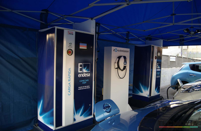 En el exterior hemos podido observar las dos entradas de corriente y distintos coches conectados a las distintas fuentes de energía, una destinada a una carga lenta similar a la que se instala en los domicilios y la otra destinada a la carga rápida con un panel informativo del progreso de la carga. El coche dispone de tres LEDS visibles desde el exterior que avisan del progreso de la recarga dependiendo del número de ellos que estén encendidos o de cual esté parpadeando.