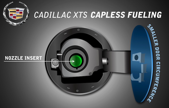El sistema de repostaje del Cadillac XTS dispone de una pequeña y estilizada tapa exterior. Tras ella no hay tapón, únicamente una abertura de doble puerta que al introducir la manguera del surtidor directamente abre las compuertas para dejar pasar el combustible y sella herméticamente con una goma el grifo para evitar no sólo que el combustible empiece a fluir por la carrocería sino también que entre aire en el depósito. Esto soluciona otra problemática del repostaje, las burbujas de aire que se forman en los conductos hacia el depósito que pueden impedir hacer un llenado completo, o al menos dificultárnoslo.