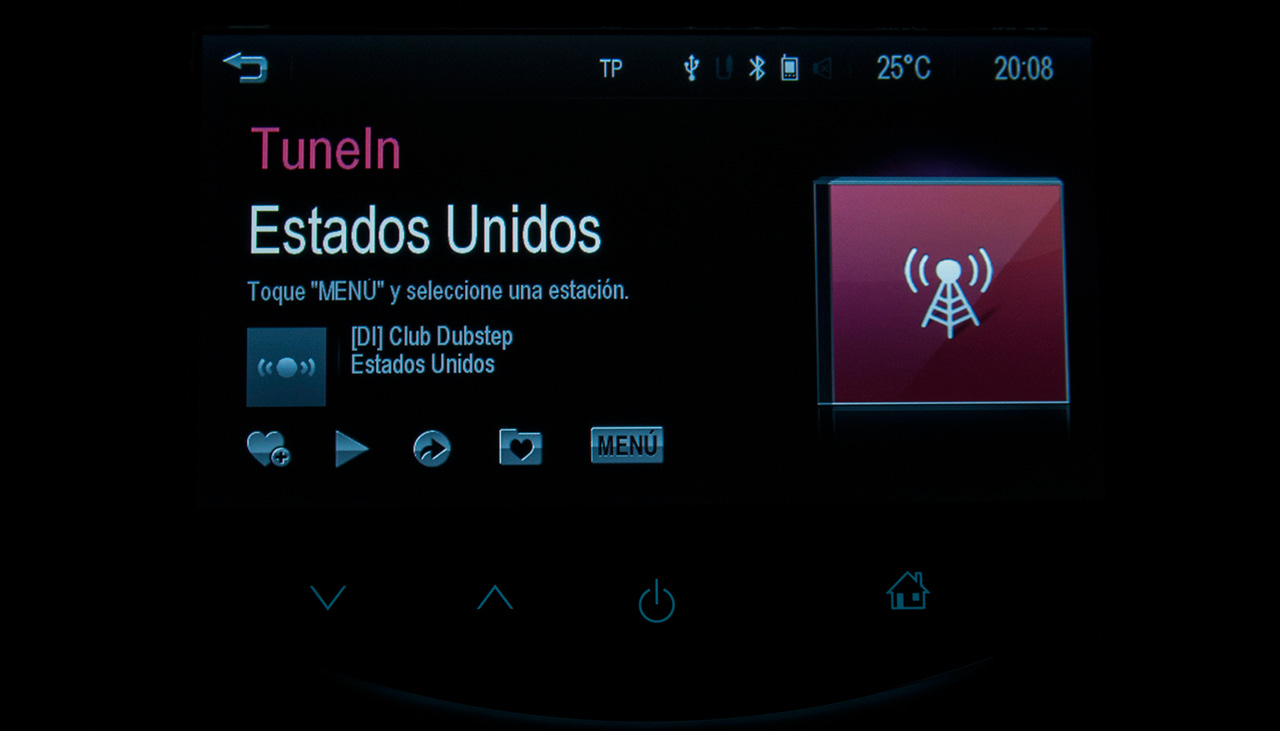 Otra de las aplicaciones que ya ha sido integrada en MyLink es TuneIn Radio. Se trata de un sintonizador digital de radios internacionales para smartphones, tablets, ordenadores personales y Smart TV que no solo permite el acceso a decenas de miles de cadenas de todo el mundo sino también búsqueda por categorías (música, deportes, noticias), géneros musicales e incluso bandas. TuneIn es gratuito y no solo compatible con Chevrolet MyLink, puesto que tanto el Tesla Model S como la conectividad de SYNC de Ford permiten su uso.