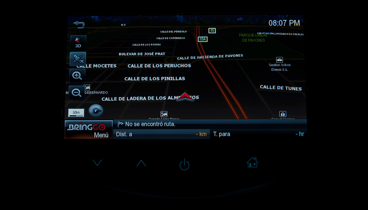 La navegación corre a cargo de BringGo. Esta aplicación puede adquirirse en el Apple Store por 0,89 euros que incluye servicio de mapas de todo el mundo y traducciones de textos y voz, por cierto mejorables, en multitud de idiomas incluido el castellano. Para prolongar durante más tiempo el uso de la aplicación y los mapas tendremos que pagar 49,99 euros, que nos garantiza el uso ilimitado con advertencias de tráfico sin cuota mensual o un paquete premium que incluye actualización de la cartografía por 69,99 euros. Es un coste nada desdeñable pero razonable si tenemos en cuenta las funciones que ofrece.
