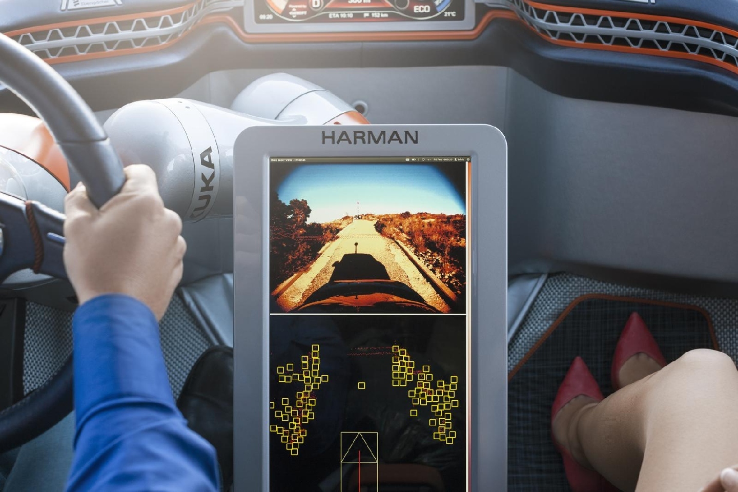 Ofreciendo soporte para intercambio de información vía NFC y recarga inalámbrica, cualquier smartphone será compatible con la interfaz desarrollada por Harman para el Rinspeed Budii. Justamente en la larga lista de socios colaboradores encontramos firmas como KUKA, encargada de fabricar el brazo robótico que soporta volante y mandos, NXP para los sistemas de carga inalámbrica o Skai para la confección de los nuevos tejidos antimanchas que tapizan el habitáculo.